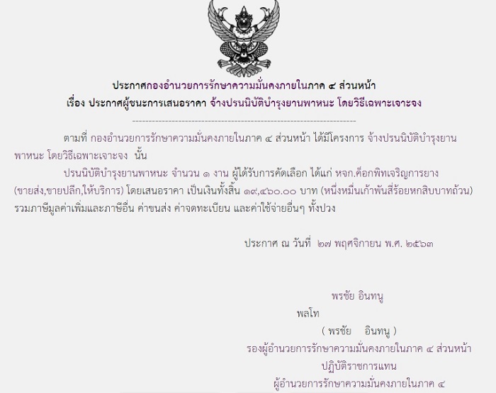 ประกาศผู้ชนะการเสนอราคา จ้างปรนนิบัติบำรุงยานพาหนะ โดยวิธีเฉพาะเจาะจง (19,460.00)