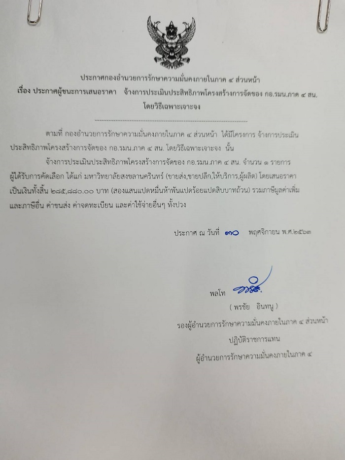 ประกาศผู้ชนะการเสนอราคา จ้างการประเมินประสิทธิภาพโครงสร้างการจัดของ กอ.รมน.ภาค ๔ สน. โดยวิธีเฉพาะเจาะจง (285,880.00)
