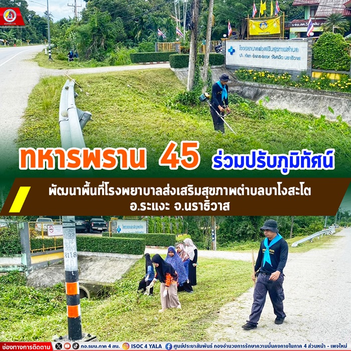 เมื่อวันที่ 19 กันยายน 2567 เวลา 16.00 น. หน่วยเฉพาะกิจกรมทหารพรานที่ 45 จัดกำลังพล ชุดปฏิบัติการกิจการพลเรือน กองร้อยทหารพรานที่ 4508 ร่วมกับ เจ้าหน้าที่โรงพยาบาลส่งเสริมสุขภาพตำบล และ อาสาสมัครสาธารณสุขประจำหมู่บ้านเจ๊ะเก ร่วมกันตัดหญ้าปรับภูมิทัศน์พัฒนาพื้นที่บริเวณหน้าโรงพยาบาลส่งเสริมสุขภาพตำบลบาโงสะโต หมูที่ 2 ตำบลบาโงสะโต อำเภอระแงะ จังหวัดนราธิวาส เพื่อความเป็นระเบียบเรียบร้อยสะอาดสวยงาม และสร้างความปลอดภัยแก่ประชาชนผู้ที่เดินทางสัญจรไป-มา