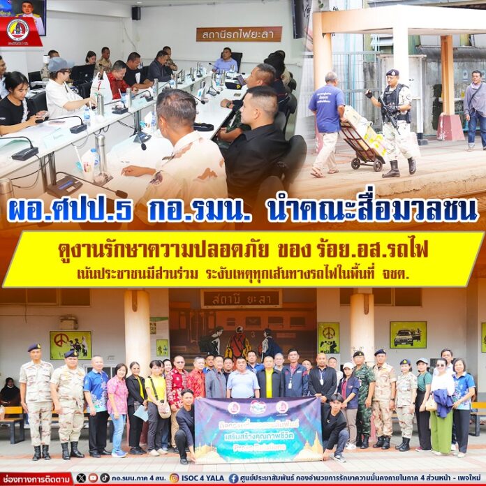 เมื่อวันที่ (21 กันยายน 2567) เวลา 10.00 น. ที่สถานีรถไฟยะลา ตำบลสะเตง อำเภอเมืองยะลา จังหวัดยะลา พลโท ธัชพล เปี่ยมวุฒิ ผู้อำนวยการศูนย์ประสานการปฏิบัติที่ 5 กองอำนวยการรักษาความมั่นคงภายในราชอาณาจักร นำคณะสื่อมวลชนส่วนกลาง ดูงานการขับเคลื่อนงาน ของกองร้อยปฏิบัติการพิเศษที่ 2 กองบัญชาการกองอาสารักษาดินแดน กองร้อยกองอาสารักษาดินแดนรถไฟ ( ร้อย.อส.รถไฟ) โดยมี พันเอก อนุชา โนนคู่เขตโขง รองเลขาธิการ กองอำนวยการรักษาความมั่นคงภายในภาค 4 ส่วนหน้า , หัวหน้าส่วนราชการ ทหาร ตำรวจ ฝ่ายปกครอง และหน่วยงานที่เกี่ยวข้องให้การต้อนรับ
