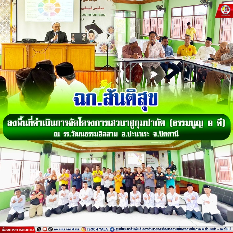 หน่วยเฉพาะกิจสันติสุข โดย ชุดสันติสุขที่ 102 ร่วมกับ ชุดทักษิณสัมพันธ์ที่ 111 และส่วนราชการในพื้นที่ ดำเนินการจัดโครงการเสวนาฮูกุมปากัต เพื่อสร้างความสัมพันธ์อันดี และเป็นแนวทางในการแก้ไขปัญหาภายในสถานศึกษาในการขับเคลื่อนฮูกุมปากัต หรือ (ธรรมนูญ 9 ดี) สร้างสังคมแห่งการให้อภัย และอยู่ร่วมกันภายใต้สังคม พหุวัฒนธรรม พร้อมเชิญชวนร่วมแสดงสัญลักษณ์ ( WE ARE THAI ) “เราคือไทย” โดยมี นางมัสวิน มะสา ปลัดประจำอำเภอปะนาเระ เป็นประธาน ณ โรงเรียนวัฒนธรรมอิสลาม บ้านพ่อมิ่ง หมู่ที่ ๓ ตำบลพ่อมิ่ง อำเภอปะนาเระ จังหวัดปัตตานี