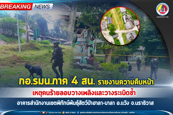จากกรณีเหตุการณ์ เมื่อช่วงค่ำของวันที่ 21 กันยายน 2567 ที่ผ่านมา กลุ่มคนร้ายได้ลอบวางเพลิงอาคารสำนักงานเขตพิทักษ์พันธุ์สัตว์ป่าฮาลา -บาลา บ้านบาลา หมู่ที่ 5 ตำบลโละจูด อำเภอแว้ง จังหวัดนราธิวาส ได้รับความเสียหาย และจับกุมตัวเจ้าหน้าที่ป่าไม้ จำนวน 4 นาย ก่อนจะหลบหนีไป คนร้ายได้นำอาวุธปืนลูกซอง (ของทางราชการ) จำนวน 10 กระบอก ปืนพกสั้น จำนวน 1 กระบอก และโทรศัพท์มือถือของเจ้าหน้าที่ไปด้วย ต่อมาเมื่อวันที่ 22 กันยายน 2567 ได้เกิดเหตุระเบิดขึ้นภายในบริเวณสำนักงานเขตรักษาพันธุ์สัตว์ป่าฮาลา – บาลา จำนวน 2 ลูก ซึ่งคาดว่าคนร้ายได้ลอบวางระเบิดไว้ก่อนที่จะทำการลอบวางเพลิง โดยตั้งเวลาระเบิดไว้ที่ 10.02 น. จำนวน 1 ลูก และเวลา 11.02 น. จำนวน 1 ลูก จากเหตุดังกล่าวทำให้ไม่มีผู้ใดได้รับบาดเจ็บ เจ้าหน้าที่ยังคงปิดกั้นพื้นที่เกิดเหตุ รวมถึงได้ดำเนินการทำเส้นทางให้เกิดความปลอดภัย