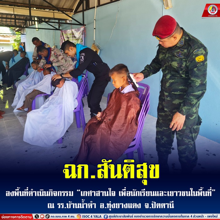 เมื่อวันที่ 23 กันยายน 2567 หน่วยเฉพาะกิจสันติสุข โดยชุดสันติสุขที่ 105 ร่วมกับ อาสาสมัครชุดคุ้มครองตำบลน้ำดำ กองร้อยอำเภอทุ่งยางแดงที่ 11 ร่วมกิจกรรม “เกศาสานใจ เพื่อนักเรียนและเยาวชนในพื้นที่” โดยการให้บริการตัดผมกับเด็กนักเรียนชาย เพื่อให้เด็กนักเรียนมีทรงผมสั้น สะอาดเรียบร้อย และยังเป็นการช่วยแบ่งเบาภาระลดค่าใช้จ่ายในครัวเรือนของนักเรียน และผู้ปกครอง เป็นการสร้างความเชื่อมั่นให้กับบุคลากร เด็ก นักเรียนเยาวชนในพื้นที่ โดยใช้กิจกรรม แสดงสัญลักษณ์ WE ARE THAI (เราคือไทย) พร้อมเป็นการแสดงออกถึงความจงรักภักดีต่อชาติ ศาสนาพระมหากษัตริย์ และความภูมิใจที่ได้เกิดเป็น “ไทย” ณ โรงเรียนบ้านน้ำดำ หมู่ที่ 5 ตำบลน้ำดำ อำเภอทุ่งยางแดง จังหวัดปัตตานี