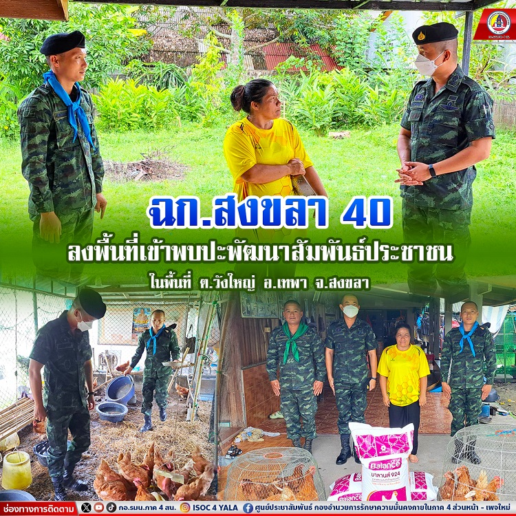 ในการนี้ผู้บังคับหน่วยเฉพาะกิจสงขลา 40 ได้มอบพันธุ์ไก่ไข่จำนวน 50 ตัว พร้อมอาหารไก่ เพื่อลดค่าใช้จ่ายภายในครอบครัว อีกทั้งยังเป็นการส่งเสริมสร้างอาชีพ สร้างรายได้ให้กับครอบครัวดังกล่าว อีกทั้งยังสร้างขวัญกำลังใจที่ดี เพราะทหารจะอยู่เคียงข้างประชาชนเสมอ