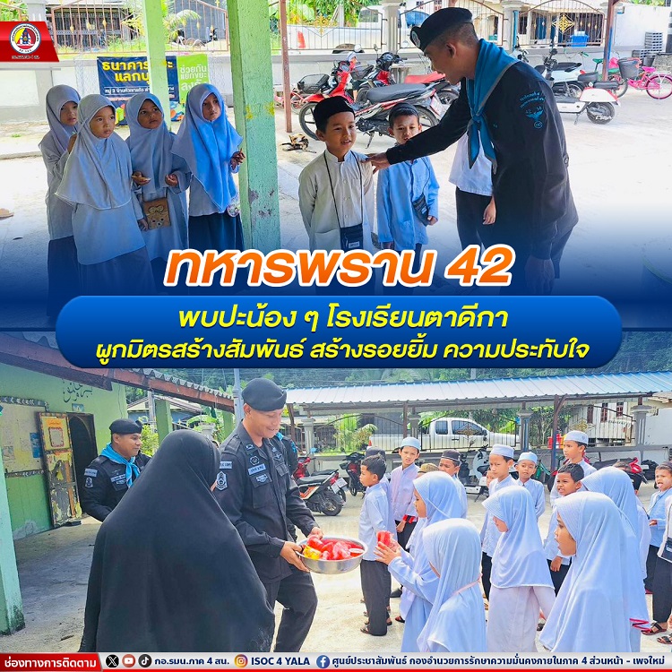 ทั้งนี้ เจ้าหน้าที่ทหารพราน ยังได้มอบขนม และของเล่น เพื่อเสริมสร้างพัฒนาการของเด็กนักเรียนในพื้นที่ พร้อมทั้งสอบถามความเป็นอยู่และการเรียนการสอนของนักเรียนและครู สร้างรอยยิ้มและความประทับใจ ทั้งยังเป็นการสร้างความสัมพันธ์อันดีระหว่างเจ้าหน้าที่รัฐกับเยาวชนในพื้นที่ อันจะนำไปสู่การร่วมกันสร้างสันติสุขที่ยั่งยืน “เพราะเราคือพี่น้องกัน”