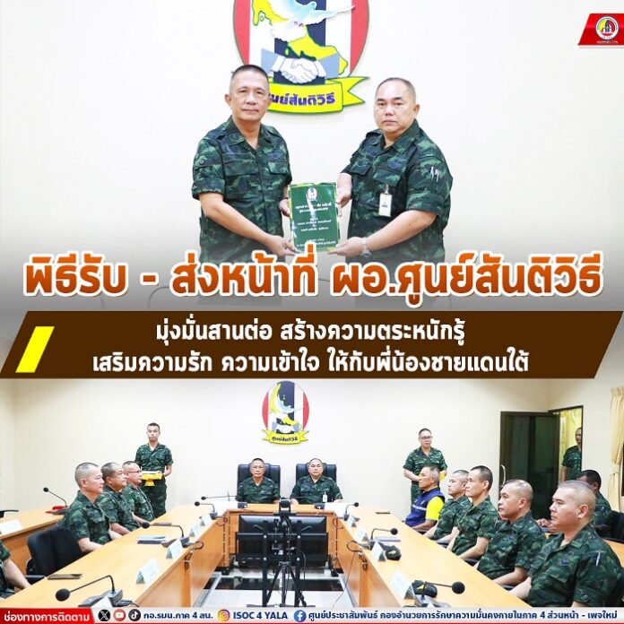 วันนี้ 30 กันยายน 2567 เวลา 09.00 น. ณ ห้องประชุมกองสันติวิธี ศูนย์สันติวิธี ค่ายสิรินธร ตำบลเขาตูม อำเภอยะรัง จังหวัดปัตตานี ศูนย์สันติวิธี จัดพิธีรับ – ส่งหน้าที่และมอบการบังคับบัญชา ระหว่าง พลโท ปราโมทย์ พรหมอินทร์ แม่ทัพน้อยที่ 4 /รองผู้อำนวยการรักษาความมั่นคงภายในภาค 4 ส่วนหน้า/ผู้อำนวยการศูนย์สันติวิธี (ท่านเก่า) กับ พันเอก เฉลิมชัย สุทธินวล ผู้อำนวยการศูนย์สันติวิธี (ท่านใหม่) โดยได้กระทำพิธีลงนามในเอกสารรับ-ส่งหน้าที่ พร้อมทั้งจัดประชุมรับมอบนโยบายการขับเคลื่อนการสร้างความตระหนักรู้แก่ประชาชนในพื้นที่จังหวัดชายแดนภาคใต้ ตามนโยบายของรัฐบาล ซึ่งมีคณะผู้บังคับบัญชา กำลังพลหน่วยขึ้นตรงศูนย์สันติวิธีเข้าร่วมในพิธี