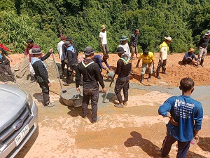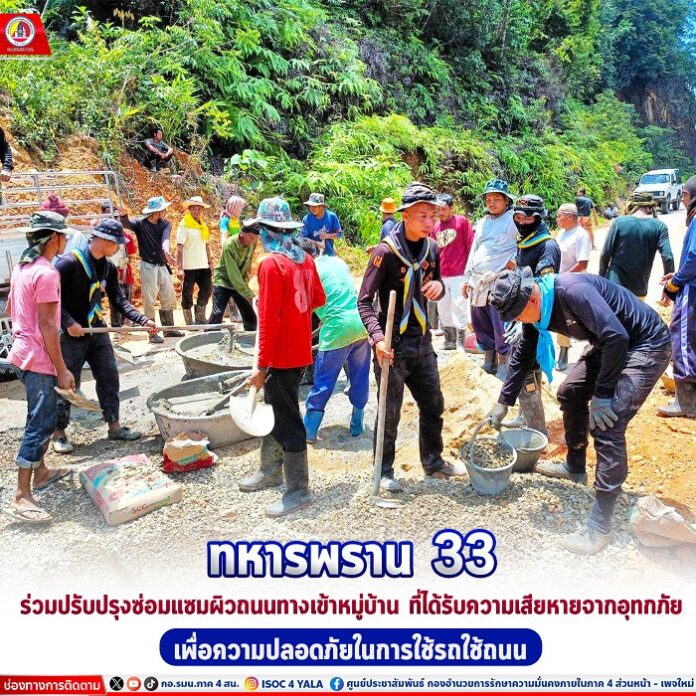 หน่วยเฉพาะกิจกรมทหารพรานที่ 33 จัดกำลังพลชุดปฏิบัติการกิจการพลเรือน กองร้อยทหารพรานที่ 3305 ร่วมกับ ผู้นำหมู่บ้าน ผู้นำชุมชน และประชาชนในพื้นที่ ร่วมปรับปรุงซ่อมแซมผิวถนนทางเข้าหมู่บ้าน ณ บ้านลาตอซูแก หมู่ที่ 12 ตำบลตลิ่งชัน อำเภอบันนังสตา จังหวัดยะลา ซึ่งได้รับความเสียหายจากเหตุอุทกภัยที่ผ่านมา โดยการเทปูนซ่อมแซมพื้นผิวถนน เพื่อให้ประชาชนในพื้นที่ได้ใช้สัญจรเดินทางสะดวกสบาย ปลอดภัยจากอุบัติเหตุ