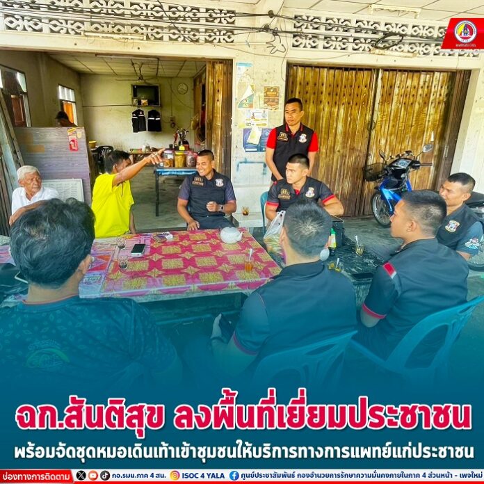 วันที่ 1 ตุลาคม 2567 ที่ร้านน้ำชาแบแด บ้านบ้านพ่อมิ่ง หมู่ที่ 3 ตำบลพ่อมิ่ง อำเภอปะนาเระ จังหวัดปัตตานี ชุดสันติสุขที่ 102 หน่วยเฉพาะกิจสันติสุข ร่วมกับ ชุดทักษิณสัมพันธ์ที่ 111 ลงพื้นที่เข้าพบปะเยี่ยมเยียนประชาชน พร้อมจัดชุดหมอเดินเท้าเข้าชุมชนโดยการให้บริการทางการแพทย์เบื้องต้น และมอบยาเวชภัณฑ์ ตลอดจนให้คำแนะนำวิธีการดูแลสุขภาพ และวิธีการป้องกันตนเองจากโรคที่มาตามฤดูกาล