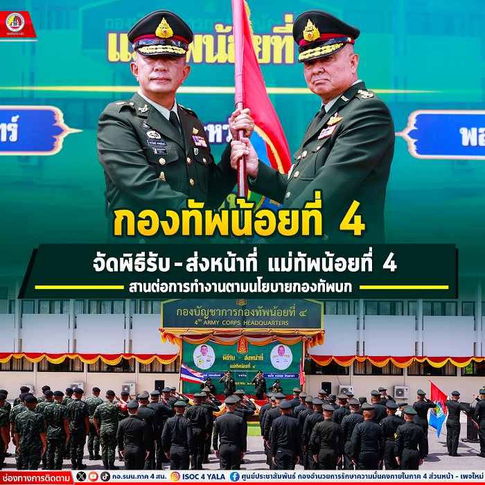 วันนี้ (2 ตุลาคม 2567) เวลา 13.45 น. ณ กองบัญชาการกองทัพน้อยที่ 4 อำเภอคลองหอยโข่ง จังหวัดสงขลา กองทัพน้อยที่ 4 จัดพิธีรับ-ส่งหน้าที่ และมอบการบังคับบัญชา ระหว่าง พลเอก ปราโมทย์ พรหมอินทร์ รองผู้อำนวยการ สำนักงานปฏิบัติภารกิจรักษาความมั่นคงภายในกองทัพบก / อดีตแม่ทัพน้อยที่ 4 และ พลโท คมกฤช รัตนฉายา แม่ทัพน้อยที่ 4 (ท่านใหม่) โดยมี คณะผู้บังคับบัญชา พร้อมด้วยกำลังพลกองทัพน้อยที่ 4 เข้าร่วมพิธี
