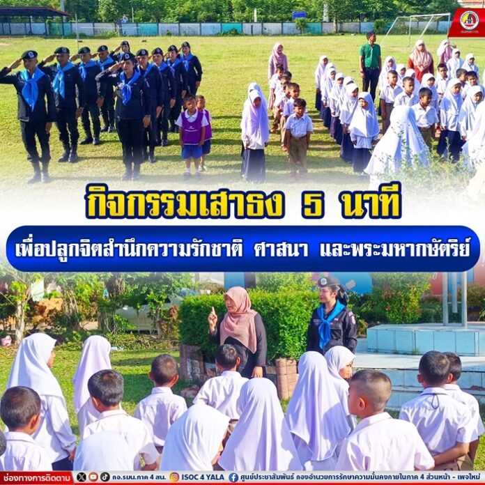 เมื่อวันที่ 2 ตุลาคม 2567 เวลา 08.00 น. ที่โรงเรียนบ้านวังพญา ตำบลวังพญา อำเภอรามัน จังหวัดยะลา หน่วยเฉพาะกิจกรมทหารพรานที่ 41 โดย ผู้บังคับหมวดทหารพรานหญิง พร้อมด้วยกำลังพล ชุดปฏิบัติการกิจการพลเรือน หมวดทหารพรานหญิง 41 และชุดปฏิบัติการกิจการพลเรือน กองร้อยทหารพรานที่ 4113 ลงพื้นที่พบปะพัฒนาสัมพันธ์กับบุคลากรทางการศึกษา และนักเรียน พร้อมร่วมกิจกรรมหน้าเสาธง 5 นาที เพื่อปลูกฝังอุดมการณ์ความรักชาติ ศาสนา และสถาบันพระมหากษัตริย์ ปฏิบัติตนอยู่ในกรอบของกฎหมายยึดหลัก “ความสงบ และรู้ รัก สามัคคี” ตลอดจนปกป้องชาติ ศาสนา พระมหากษัตริย์ ให้สามสถาบันหลักของชาติเป็นศูนย์รวมจิตใจของปวงชนในชาติ และสามารถดำรงอยู่คู่กับประชาธิปไตยอย่างมั่นคงต่อไป