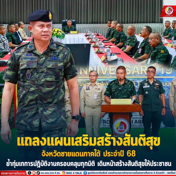 เมื่อวันที่ 4 ตุลาคม 2567 เวลา 15.30 น. ที่สโมสรนายทหารสัญญาบัตร กองพลทหารราบที่ 15 ค่ายสมเด็จพระสุริโยทัย ตำบลบ่อทอง อำเภอหนองจิก จังหวัดปัตตานี พลโท ไพศาล หนูสังข์ แม่ทัพภาคที่ 4 / ผู้อำนวยการรักษาความมั่นคงภายในภาค 4 เป็นประธานการประชุมแถลงแผนเสริมสร้างสันติสุขจังหวัดชายแดนภาคใต้ ประจำปี 2568 พร้อมด้วย ผู้อำนวยการ สำนักอำนวยการกองอำนวยการรักษาความมั่นคงภายในภาค 4 ส่วนหน้า คณะผู้บังคับบัญชาหน่วยขึ้นตรงกองอำนวยการรักษาความมั่นคงภายในภาค 4 ส่วนหน้า ตลอดจนหัวหน้าส่วนราชการ ทหาร ตำรวจ และฝ่ายปกครอง เข้าร่วมรับมอบนโยบาย