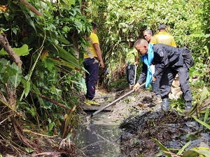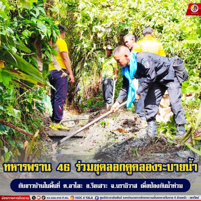 วันที่ 6 ตุลาคม 2567 เวลา 10.00 น. หน่วยเฉพาะกิจกรมทหารพรานที่ 46 จัดกำลังพลกองร้อยทหารพราน ร่วมกับ ผู้ใหญ่บ้านหมู่ที่ 1 เจ้าหน้าที่องค์การบริหารส่วนตำบลลาโละ และประชาชนจิตอาสาในพื้นที่ ร่วมกิจกรรมจิตอาสา (ฮูกุมปากัต ดีที่ 5 สิ่งแวดล้อมสมบูรณ์) ณ บ้านบือแรง หมู่ที่ 1 ตำบลลาโละ อำเภอรือเสาะ จังหวัดนราธิวาส เนื่องจากช่วงหน้าฝน การพัฒนาคูระบายน้ำในครั้งนี้จะช่วยป้องกันน้ำท่วม และกำจัดแหล่งเพาะพันธุ์ยุงลาย จากความร่วมมือและความสามัคคีของทุกคน ทำให้การปฏิบัติงานผ่านไปด้วยดี