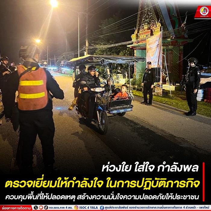 เมื่อวันที่ 8 ตุลาคม 2567 เวลา 21.00 น. พันเอก สุรศักดิ์ พึ่งแย้ม ผู้บังคับหน่วยเฉพาะกิจกรมทหารพรานที่ 45 เดินทางลงพื้นที่ตรวจเยี่ยมให้กำลังใจชุดปฏิบัติการของกองร้อยหน่วยขึ้นตรง และหน่วยขึ้นควบคุมทางยุทธการ ที่ปฏิบัติภารกิจตามแผนยุทธการควบคุมพื้นที่ ในการตั้งจุดตรวจ/จุดสกัด หน้าฐานปฏิบัติการ และพื้นที่รับผิดชอบ พร้อมทั้งมอบแนวทางในการปฏิบัติงาน เน้นย้ำเพิ่มมาตรการ ระวังป้องกันฐาน และมีความพร้อมตลอดเวลา สามารถตอบโต้ฝ่ายตรงข้ามได้ทันท่วงที โดยได้เน้นย้ำการปฏิบัติงานตามนโยบายและสั่งการของผู้บังคับบัญชา และความห่วงใยจากผู้บังคับบัญชา ในการดูแลควบคุมพื้นที่ให้ปลอดภัย เพื่อสร้างความมั่นใจให้พี่น้องประชาชน พร้อมกันนี้ได้มอบสิ่งของบริโภค เพื่อเป็นขวัญและกำลังใจให้กับกำลังพลที่ปฏิบัติหน้าที่ ในพื้นที่ อำเภอระแงะ จังหวัดนราธิวาส