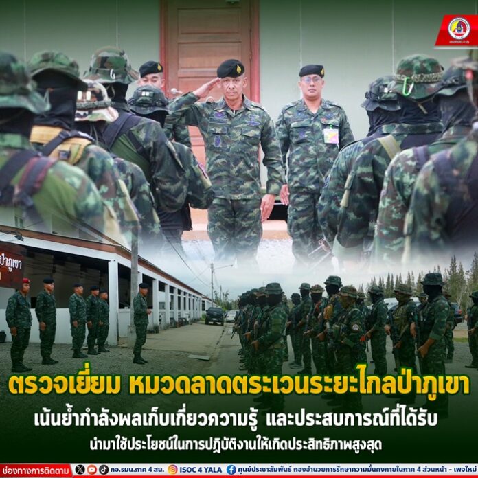 เมื่อวันที่ 10 ตุลาคม 2567 เวลา 15.00 น. พลตรี เฉลิมพร ขำเขียว ผู้บัญชาการกองพลทหารราบที่ 15 / ผู้บังคับหน่วยเฉพาะกิจนราธิวาส ตรวจเยี่ยมหมวดลาดตระเวนระยะไกลป่าภูเขา ณ หน่วยเฉพาะกิจนราธิวาส ค่ายกัลยาณิวัฒนา ตำบลกะลุวอ อำเภอเมือง จังหวัดนราธิวาส ซึ่งจัดตั้งขึ้นเพื่อปฏิบัติภารกิจในพื้นที่ป่าภูเขา พื้นที่ป่าพรุ และพื้นที่ห่างไกลเข้าถึงยากลำบาก พร้อมทั้งได้เน้นย้ำกำลังพลให้เก็บเกี่ยวความรู้ และประสบการณ์ที่ได้รับให้มากที่สุด เพื่อที่จะสามารถนำไปใช้ในการปฏิบัติงาน ในการเข้าพื้นที่ได้อย่างมีประสิทธิภาพ และต้องมีการบูรณาการกำลังของหน่วยให้มีความเหมาะสม สอดคล้องในการปฏิบัติภารกิจร่วมกันได้อย่างเป็นรูปธรรม นอกจากนี้ยังได้พบปะพูดคุยกับกำลังพลชุดหมวดลาดตระเวนระยะไกลป่าภูเขา ก่อนมอบสิ่งของอุปโภค บริโภค เพื่อเป็นขวัญและกำลังใจให้กับกำลังพลในการปฏิบัติงานต่อไป