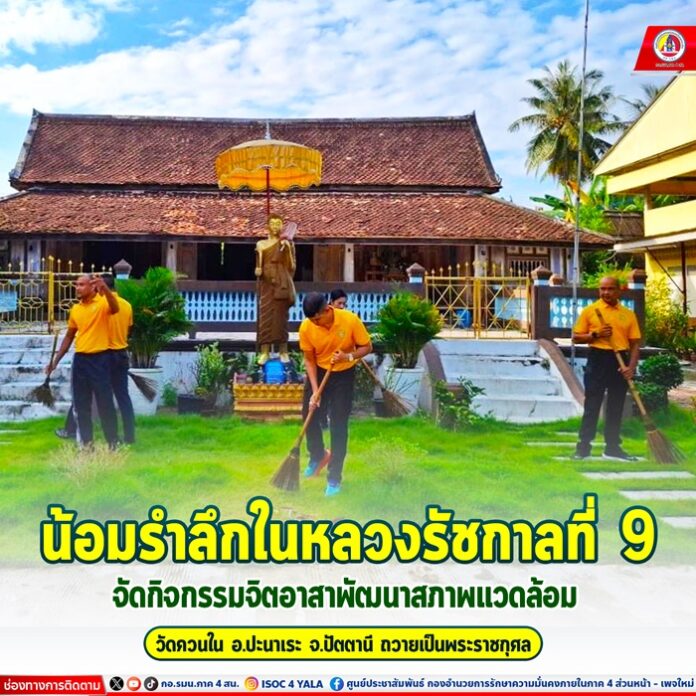 โดยเช้าวันนี้ 11 ตุลาคม 2567 เวลา 08.30 น. ร้อยเอกหญิง วราภรณ์ เขียดน้อย หัวหน้าฝ่ายกิจการพลเรือน พร้อมด้วย กำลังพลของหน่วยเฉพาะกิจกรมทหารพรานที่ 42 ร่วมกิจกรรมจิตอาสาพัฒนาบำเพ็ญประโยชน์ศาสนสถาน เนื่องในวันสำคัญของชาติไทย วันคล้ายวันสวรรคต พระบาทสมเด็จพระบรมชนกาธิเบศร มหาภูมิพลอดุลยเดชมหาราช บรมนาถบพิตร 13 ตุลาคม 2567 ณ วัดควนใน บ้านพิกุล ตำบลควน อำเภอปะนาเระ จังหวัดปัตตานี เพื่อร่วมกันแสดงออกถึงความจงรักภักดีและน้อมรำลึกในพระมหากรุณาธิคุณอันหาที่สุดมิได้ ที่พระองค์ได้ทรงทุ่มเทกำลังพระวรกาย ในการทรงพระราชกรณียกิจนานัปการ เพื่อประโยชน์สุขแห่งปวงพสกนิกรโครงการในพระราชดำริน้อยใหญ่ ก่อให้เกิดประโยชน์อย่างอเนกอนันต์แก่ประเทศชาติ