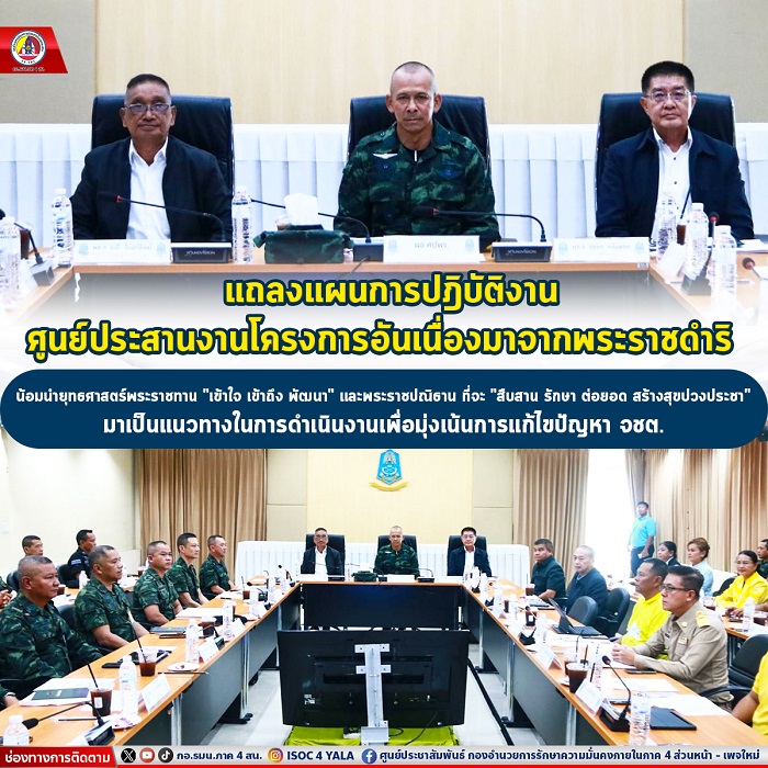 โดยศูนย์ประสานงานโครงการอันเนื่องมาจากพระราชดำริ (ศปพร.) ได้ดำเนินงานตามแผนเสริมสร้างสันติสุขจังหวัดชายแดนภาคใต้ ประจำปี 2568 ของกองอำนวยการรักษาความมั่นคงภายในภาค 4 ส่วนหน้า ซึ่งกองอำนวยการรักษาความมั่นคงภายในภาค 4 ส่วนหน้า รับผิดชอบในการบูรณาการงานการแก้ปัญหางานการป้องกันปัญหา และการเสริมสร้างความมั่นคงในพื้นที่จังหวัดชายแดนภาคใต้ เพื่อรักษาความปลอดภัยในชีวิตและทรัพย์สิน พัฒนายกระดับคุณภาพชีวิตของประชาชนให้ดีขึ้น และนำสันติสุขกลับสู่จังหวัดชายแดนภาคใต้อย่างยั่งยืน ภายใต้บริบทของสังคมพหุวัฒนธรรม
