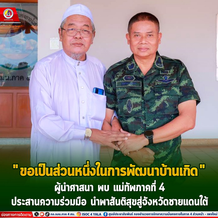 ก่อนที่ประธานคณะกรรมการอิสลามประจำจังหวัดนราธิวาสจะอวยพรให้แม่ทัพภาคที่ 4 และเจ้าหน้าที่ปฏิบัติภารกิจจังหวัดชายแดนภาคใต้ด้วยความปลอดภัยเกิดประโยชน์แก่ประเทศชาติพี่น้องในพื้นที่อย่างสูงสุด