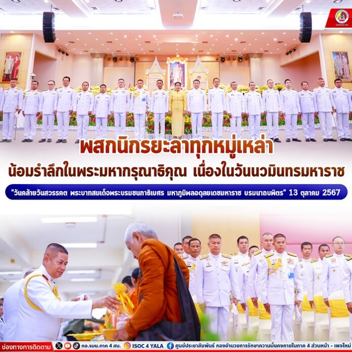 วันที่ 13 ตุลาคม 2567 เวลา 07.00 น. ที่หอประชุมเฉลิมพระเกียรติ 80 พรรษา 5 ธันวาคม 2550 มหาวิทยาลัยราชภัฏยะลา อำเภอเมือง จังหวัดยะลา นายอำพล พงศ์สุวรรณ ผู้ว่าราชการจังหวัดยะลา เป็นประธานในการประกอบพิธีเนื่องในวันนวมินทรมหาราช วันคล้ายวันสวรรคตพระบาทสมเด็จพระบรมชนกาธิเบศร มหาภูมิพลอดุลยเดชมหาราช บรมนาถบพิตร 13 ตุลาคม 2567 โดยมี พลโท ไพศาล หนูสังข์ แม่ทัพภาคที่ 4/ผู้อำนวยการรักษาความมั่นคงภายในภาค 4 พร้อมด้วยหัวหน้าส่วนราชการ ทหาร ตำรวจ และประชาชนเข้าร่วม ทั้งนี้ภายในพิธีมีการสวดพระพุทธมนต์ ทำบุญตักบาตร ถวายพระราชกุศล และพิธีวางพวงมาลา เบื้องหน้าพระบรมฉายาลักษณ์ถวายราชสักการะ พระบาทสมเด็จพระบรมชนกาธิเบศร มหาภูมิพลอดุลยเดชมหาราช บรมนาถบพิตร และกล่าวน้อมรำลึกในพระมหากรุณาธิคุณ ยืนสงบนิ่งเป็นเวลา 89 วินาที