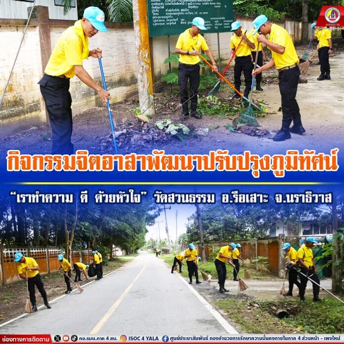 เมื่อวันที่ 15 ตุลาคม 2567 เวลา 11.00 น. ณ วัดสวนธรรม หมู่ที่ 2 ตำบลรือเสาะออก อำเภอรือเสาะ จังหวัดนราธิวาส พันเอก นพดล พรหมมาก รองผู้บังคับหน่วยเฉพาะกิจกรมทหารพรานที่ 46 ได้นำกำลังพลจิตอาสาพระราชทานของหน่วย ดำเนินกิจกรรมจิตอาสาพัฒนาปรับปรุงภูมิทัศน์ เพื่อเป็นการน้อมรำลึกสำนึกในพระมหากรุณาธิคุณ ที่พระบาทสมเด็จพระเจ้าอยู่หัวได้พระราชทานโครงการจิตอาสาพระราชทาน ตามแนวพระราชดำริ ด้วยทรงมุ่งหวังให้พสกนิกรทุกหมู่เหล่ามีความสมัครสมานสามัคคี ร่วมมือร่วมใจประกอบกิจกรรมสาธารณะ เพื่อประโยชน์สุขของชุมชนส่วนรวมโดยไม่หวังสิ่งตอบแทน โดยกิจกรรมจิตอาสาพระราชทานในครั้งนี้ ได้ร่วมมือร่วมใจกันตัดหญ้า กวาดขยะ กวาดลานบริเวณโบสถ์ เพื่อให้เกิดความเป็นระเบียบสวยงาม และมีทัศนียภาพที่งดงามภายในชุมชนต่อไป