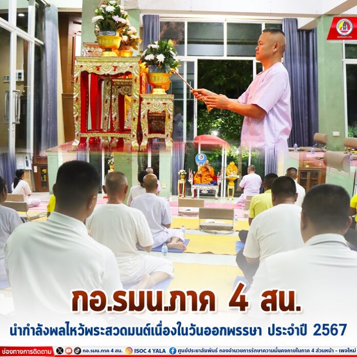 เมื่อวันที่ 17 ตุลาคม 2567 เวลา 19.00 น. กองอำนวยการรักษาความมั่นคงภายในภาค 4 ส่วนหน้า นำกำลังพลไหว้พระสวดมนต์ ทำวัตรเย็นเจริญจิตภาวนา เนื่องในวันออกพรรษา ประจำปี 2567 ณ ลานปฏิบัติธรรมเขาพระศรีศากยมุณีพุทธโคดม ค่ายสิรินธร ตำบลเขาตูม อำเภอยะรัง จังหวัดปัตตานี โดยได้นิมนต์พระราชปัญญามุนี เจ้าคณะจังหวัดยะลา / เจ้าอาวาสวัดเวฬุวัน แสดงธรรมเทศนา เพื่อให้กำลังพลได้ปฏิบัติตนตามแบบพุทธศาสนิกชนที่ดี โดยมีการสวดมนต์ไหว้พระ รักษาศีล เห็นคุณค่าของหลักธรรมคำสั่งสอนของพระพุทธเจ้า และนำหลักธรรมปรับใช้ในชีวิตประจำวันได้อย่างถูกต้องและเหมาะสม อีกทั้งยังช่วยขัดเกลาจิตใจให้กับกำลังพลให้เป็นคนดีของสังคม ตลอดจนยังเป็นการส่งเสริมเผยแผ่พระพุทธศาสนาให้คงอยู่สืบไป