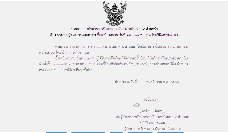 จัดซื้อ จัดจ้างประกาศผู้ชนะการเสนอราคา ประกาศผู้ชนะการเสนอราคา ซื้อเสบียงสนาม วันที่ ๑๖ – ๓๐ พ.ย.๖๓ โดยวิธีเฉพาะเจาะจง ( ๓๐๘,๔๗๕.๐๐ บาท ) December 20, 2020 856 Share Facebook Twitter Google+ Telegram LINE กอ.รมน.ภาค ๔ สน.