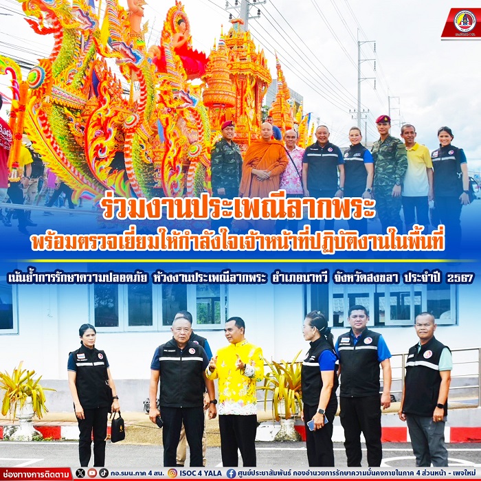 เมื่อวันที่ 18 ตุลาคม 2567 เวลา 15.00 น. ที่ วัดนาทวี อำเภอนาทวี จังหวัดสงขลา พันเอก ธนุตม์ พิศาลสิทธิวัฒน์ รองผู้บัญชาการมณฑลทหารบกที่ 42 / รองผู้อำนวยการรักษาความมั่นคงภายในจังหวัดสงขลา ส่วนหน้า เดินทางลงพื้นที่ ร่วมงานประเพณีลากพระ อำเภอนาทวี จังหวัดสงขลา ประจำปี 2567 ร่วมกับชุดควบคุมที่ 955 หน่วยเฉพาะกิจสันติสุข หน่วยเฉพาะกิจสงขลา ชุดปฎิบัติการอำเภอนาทวี ในการนี้ ได้ตรวจเยี่ยมให้กำลังใจแก่เจ้าหน้าที่ผู้ปฎิบัติงานในพื้นที่ ตลอดจนมอบสิ่งของอุปโภคบริโภค เพื่อเป็นขวัญกำลังใจแก่ผู้ปฎิบัติงานในพื้นที่