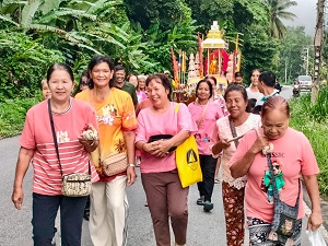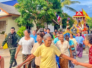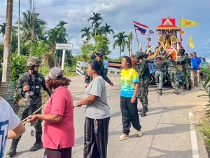 เฉกเช่นเดียวกับในพื้นที่ อำเภอบันนังสตา จังหวัดยะลา และ อำเภอยะรัง จังหวัดปัตตานี ชาวบ้าน รวมถึงส่วนราชการ ผู้นำในส่วนต่าง ๆ และเจ้าหน้าที่ทหารจาก หน่วยเฉพาะกิจกองพันทหารราบที่ 1 (ฉก.พัน.ร.ที่ 1) ได้ช่วยกันลากเรือพระที่ประดับตกแต่งอย่างปราสาทมณฑปวิจิตรงดงาม ออกจากวัดตั้งแต่เช้าตรู่ โดยเรือพระจากวัดถ้ำทะลุ เดินทางจากตำบลถ้ำทะลุ อำเภอบันนังสตา จังหวัดยะลา ส่วนเรือพระจากวัดโคกหญ้าคา (สี่เหลี่ยม) เดินทางจากตำบลคลองใหม่ อำเภอยะรัง จังหวัดปัตตานี ซึ่งทั้งสองขบวนเคลื่อนขบวนแห่ต่างพื้นที่กัน แต่จะเคลื่อนขบวนไปยังหมุดหมายเดียวกัน นั้นคือ ศูนย์เยาวชนเทศบาลนครยะลา ซึ่งเป็นสถานที่ชุมนุมเรือพระที่จัดขึ้นในทุก ๆ ปี เพื่อให้ประชาชนทั้งในพื้นที่ และนอกพื้นที่ได้ร่วมอนุรักษ์ และสืบสานขนบธรรมเนียมวัฒนธรรมท้องถิ่นให้อยู่คู่กับชุมชนชาวไทยพุทธในพื้นที่จังหวัดชายแดนภาคใต้