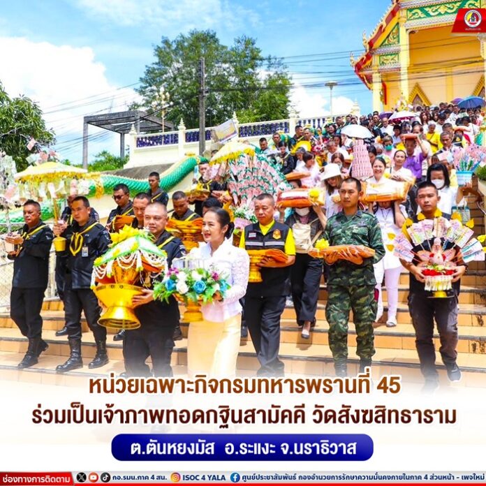 เมื่อวันที่ 19 ตุลาคม 2567 เวลา 12.30 น. ที่วัดสังฆสิทธาราม หมู่ที่ 7 ตำบลตันหยงมัส อำเภอระแงะ จังหวัดนราธิวาส พันเอก สุรศักดิ์ พึ่งแย้ม ผู้บังคับหน่วยเฉพาะกิจกรมทหารพรานที่ 45 พร้อมด้วย คุณกิติมา พึ่งแย้ม ประธานสมาคมแม่บ้านทหารบก สาขา กรมทหารพรานที่ 45 ฝ่ายอำนวยการ, ผู้บังคับกองร้อย, และกำลังพลของหน่วย ร่วมเป็นเจ้าภาพทอดกฐินสามัคคี ประจำปี 2567 เพื่อเป็นการอนุรักษ์สืบสานประเพณีวัฒนธรรมอันดีงามของพระพุทธศาสนา เพื่อนำรายได้ร่วมสมทบทุนทำนุบำรุงพระพุทธศาสนา บูรณปฏิสังขรณ์เสนาสนะ ถาวรวัตถุ และเป็นทุนการศึกษา ของพระภิกษุและสามเณร โดยมี ส่วนราชการ, หน่วยกำลังในพื้นที่, ผู้นำท้องที่, คณะกรรมการวัด และพุทธศาสนิกชนในพื้นที่เข้าร่วมจำนวนมาก