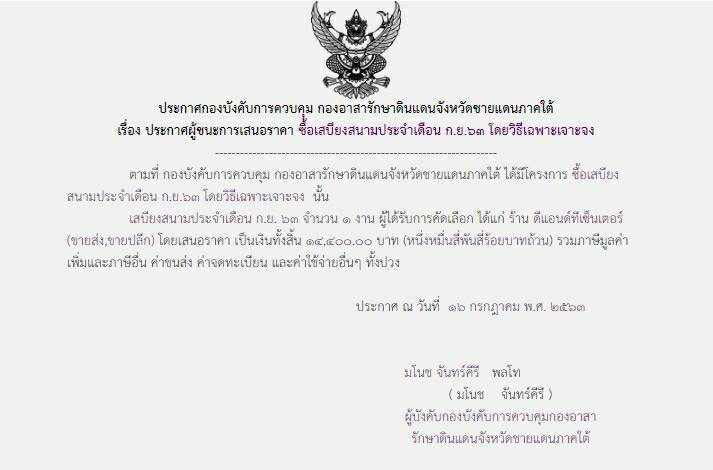 ประกาศผู้ชนะการเสนอราคา ซื้อเสบียงสนามประจำเดือน ก.ย.๖๓ โดยวิธีเฉพาะเจาะจง