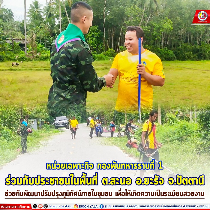 เมื่อวันที่ 20 ตุลาคม 2567 หน่วยเฉพาะกิจ กองพันทหารราบที่ 1 (ฉก.พัน.ร.ที่ 1) จัดกำลังพลของหน่วย ร่วมกับ พี่น้องประชาชนในพื้นที่ หมู่ที่ 4 บ้านคางา ตำบลสะนอ อำเภอยะรัง จังหวัดปัตตานี ช่วยกันพัฒนา และปรับปรุงภูมิทัศน์ บริเวณริมถนนทางหลวงชนบทภายในชุมชน เพื่อให้เกิดความเป็นระเบียบ เรียบร้อย สะอาด และน่ามอง รวมทั้งเพื่อความสะดวกในการรักษาความปลอดภัยพี่น้องประชาชนในการสัญจรบนท้องถนนอีกด้วย