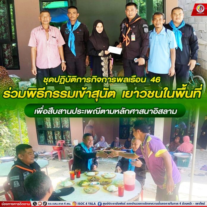เมื่อวันที่ 20 ตุลาคม 2567 เวลา 12.00 น. ณ บ้านเลขที่ 12/8 หมู่ที่ 3 บ้านลูโบะปูโละ ตำบลสามัคคี อำเภอรือเสาะ จังหวัดนราธิวาส ร้อยโท สุรศักดิ์ จินดานิมิตร ผู้บังคับกองร้อยทหารพรานที่ 4601 พร้อมด้วย กำลังพลชุดปฏิบัติการกิจการพลเรือน หน่วยเฉพาะกิจกรมทหารพรานที่ 46 ลงพื้นที่เข้าร่วมพิธีกรรมเข้าสุนัตของศาสนาอิสลาม ได้แก่ เด็กชายจิระยุทธ์ ต่วนสูงเนิน อายุ 13 ปี , เด็กชายสันติภาพ บุญคำ อายุ 14 ปี เพื่อสืบสานประเพณีตามหลักศาสนาอิสลาม พร้อมร่วมรับประทานอาหาร และมอบเงินสนับสนุน เพื่อสร้างขวัญกำลังใจแก่เด็กๆ ตลอดจนยังเป็นการสร้างความสัมพันธ์อันดี เพื่อนำไปสู่สันติสุขอย่างยั่งยืนระหว่างเจ้าหน้าที่ทหารกับประชาชนในพื้นที่ ทั้งนี้ประชาชนให้การต้อนรับเป็นอย่างดี และกล่าวขอบคุณเจ้าหน้าที่ทหารที่มาร่วมกิจกรรมในครั้งนี้