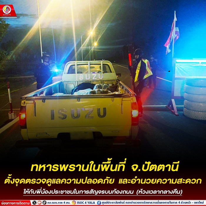 หน่วยเฉพาะกิจกรมทหารพรานที่ 44 ดำเนินการตั้งจุดตรวจ จุดสกัดในเขตพื้นที่รับผิดชอบของหน่วยทั้ง 4 อำเภอ ประกอบไปด้วย อำเภอสายบุรี, อำเภอกะพ้อ, อำเภอทุ่งยางแดง และ อำเภอไม้แก่น จังหวัดปัตตานี เพื่อปฏิบัติหน้าที่ดูแลความปลอดภัย และอำนวยความสะดวกให้กับพี่น้องประชาชน ในการสัญจรบนท้องถนนห้วงเวลากลางคืน โดยปฏิบัติหน้าที่ตั้งแต่ เวลา 18.30 – 23.59 น. ของวันที่ 21 ตุลาคม 2567 ไปจนถึงเวลา 00.01 – 06.00 น. ของวันนี้ (22 ตุลาคม 2567) เพื่อเป็นการรักษาความปลอดภัยถนนเส้นทางสายหลักและสายรอง เพื่อควบคุมพื้นที่ ดูแลป้องกันการขนย้ายสิ่งของผิดกฎหมายต่างๆ เพื่อให้พื้นที่ปลอดเหตุ ประชาชนปลอดภัย