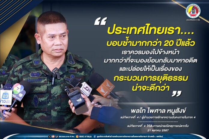 ประชาสัมพันธ์ข่าวประชาสัมพันธ์ ประเทศไทยเรา บอบช้ำมากกว่า 20 ปีแล้ว เราควรมองไปข้างหน้า มากกว่าที่จะมองย้อนกลับมาหาอดีต และปล่อยให้เป็นเรื่องของ กระบวนการยุติธรรม น่าจะดีกว่า October 21, 2024 411 Share Facebook Twitter Google+ Telegram LINE พลโท ไพศาล หนูสังข์ แม่ทัพภาคที่ 4 / ผู้อำนวยการรักษาความมั่นคงภายในภาค 4 แม่ทัพภาคที่ 4 ให้สัมภาษณ์กรณีเหตุการณ์ตากใบ 21 ตุลาคม 2567 ศูนย์ประชาสัมพันธ์ กองอำนวยการรักษาความมั่นคงภายในภาค4ส่วนหน้า
