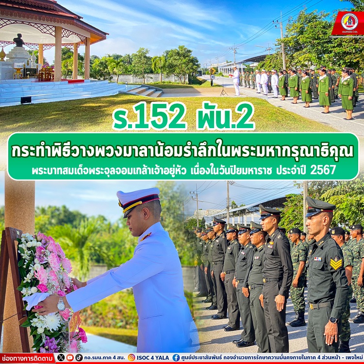 วันที่ 22 ตุลาคม 2567 เวลา 08.00 น. ร้อยโท ภาณุวัฒน์ มนสูงเนิน ผู้บังคับกองร้อยอาวุธเบา กองพันทหารราบที่ 2 กรมทหารราบที่ 152 พร้อมด้วยกำลังพล และสมาชิกสมาคมแม่บ้านทหารบก สาขากองพันทหารราบที่ 2 กรมทหารราบที่ 152 ร่วมกระทำพิธีวางพวงมาลา เบื้องหน้าพระบรมรูปพระบาทสมเด็จพระจุลจอมเกล้าเจ้าอยู่หัว รัชกาลที่ 5 เนื่องในวันครบรอบ 114 ปี วันคล้ายวันสวรรคตพระบาทสมเด็จพระจุลจอมเกล้าเจ้าอยู่หัว (วันปิยมหาราช 23 ตุลาคม 2567) เพื่อแสดงความจงรักภักดีและน้อมรำลึกในพระมหากรุณาธิคุณ ที่ทรงมีแก่พสกนิกรชาวไทยตลอดรัชสมัย ที่ทรงครองราชย์ ทรงปกครองแผ่นดินด้วยทศพิธราชธรรม บำเพ็ญพระราชกรณียกิจนานัปการ ณ ศาลาพระบรมรูป พระบาทสมเด็จพระจุลจอมเกล้าเจ้าอยู่หัว (ร.5) กองพันทหารราบที่ 2 กรมทหารราบที่ 152 ค่ายพระยาเดชานุชิต ตำบลวังพญา อำเภอรามัน จังหวัดยะลา