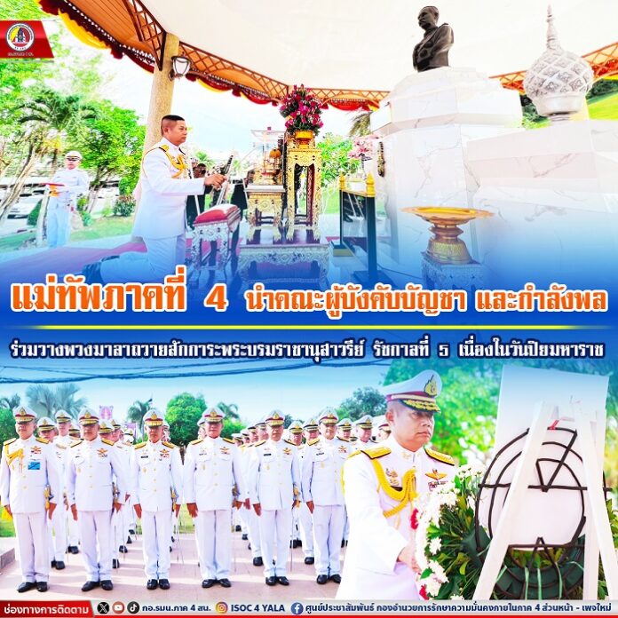 วันนี้ (23 ตุลาคม 2567) เวลา 09.05 น. ณ ศาลาประดิษฐ์สถานพระบรมรูปพระบาทสมเด็จพระจุลจอมเกล้าเจ้าอยู่หัว ค่ายสิรินธร ตำบลเขาตูม อำเภอยะรัง จังหวัดปัตตานี พลโท ไพศาล หนูสังข์ แม่ทัพภาคที่ 4/ผู้อำนวยการรักษาความมั่นคงภายในภาค 4 เป็นประธานในพิธีวางพวงมาลา ถวายราชสักการะวันคล้ายวันสวรรคตพระบาทสมเด็จพระจุลจอมเกล้าเจ้าอยู่หัว รัชกาลที่ 5 เนื่องในวันปิยมหาราช เพื่อน้อมรำลึกถึงพระมหากรุณาที่คุณพระปรีชาสามารถในด้านต่างๆ และมีพระราชกรณียกิจที่สำคัญต่อประเทศมากมาย จึงได้รับการถวายพระราชสมญานามว่า “สมเด็จพระปิยะมหาราช” ซึ่งมีความหมายว่า “พระมหากษัตริย์ที่ทรงเป็นที่รักยิ่งของปวงชน” โดยมี คณะผู้บังคับบัญชา ตลอดจนกำลังพลกองอำนวยการรักษาความมั่นคงภายในภาค 4 ส่วนหน้า เข้าร่วมพิธี