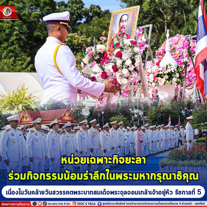เมื่อวันที่ 23 ตุลาคม 2567 เวลา 08.30 น. พันเอก ธนวัฒน์ ธนาวุฒิ หัวหน้าฝ่ายยุทธการหน่วยเฉพาะกิจยะลา เข้าร่วมกิจกรรมน้อมรำลึกในมหากรุณาธิคุณ เนื่องในโอกาสวันคล้ายวันสวรรคตพระบาทสมเด็จพระจุลจอมเกล้าเจ้าอยู่หัว รัชกาลที่ 5 (วันปิยะมหาราช 23 ตุลาคม) เพื่อน้อมรำลึกถึงพระมหากรุณาที่คุณพระปรีชาสามารถในด้านต่างๆ และมีพระราชกรณียกิจที่สำคัญต่อประเทศมากมาย จึงได้รับการถวายพระราชสมญานามว่า “สมเด็จพระปิยะมหาราช” ซึ่งมีความหมายว่า “พระมหากษัตริย์ที่ทรงเป็นที่รักยิ่งของปวงชน” โดยมี นายอำพล พงศ์สุวรรณ ผู้ว่าราชการจังหวัดยะลา เป็นประธาน พร้อมด้วยหัวหน้าส่วนราชการ หน่วยงานในพื้นที่ เข้าร่วมพิธีถวายราชสักการะและวางพวงมาลา พระบรมราชานุสาวรีย์ พระบาทสมเด็จพระจุลจอมเกล้าเจ้าอยู่หัว ณ ลานพระบรมราชานุสาวรีย์ สนามโรงพิธีช้างเผือก เทศบาลนครยะลา อำเภอเมือง จังหวัดยะลา