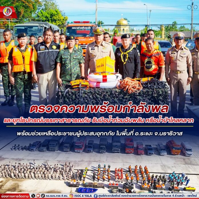เมื่อวันที่ 24 ตุลาคม 2567 เวลา 08.30 น. ที่ลานเอนกประสงค์ ที่ว่าการอำเภอระแงะ จังหวัดนราธิวาส พันเอก สุรศักดิ์ พึ่งแย้ม ผู้บังคับหน่วยเฉพาะกิจกรมทหารพรานที่ 45 พร้อมด้วย ศูนย์บรรเทาสาธารณภัย กองพันทหารราบที่ 3 กรมทหารราบที่ 151 และส่วนราชการในพื้นที่อำเภอระแงะ บูรณาการร่วมกับส่วนราชการในพื้นที่ ตรวจความพร้อมของกำลังพล ยุทโธปกรณ์ อุปกรณ์สื่อสาร และยานพาหนะทุกชนิด ให้พร้อมช่วยเหลือประชาชน และรายงานเหตุการณ์ หากเกิดกรณีน้ำท่วมฉับพลัน หรือน้ำป่าไหลหลาก ให้สามารถปฏิบัติภารกิจช่วยเหลือผู้ประสบภัยได้อย่างทันท่วงที และมีประสิทธิภาพ โดยมี นายวิมุตติ อำนักมณี นายอำเภอระแงะ/ผู้อำนวยศูนย์ปฏิบัติการอำเภอระแงะ เป็นประธาน