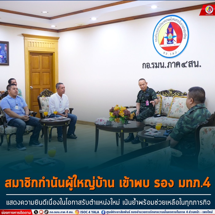 เมื่อวันที่ 24 ตุลาคม 2567 เวลา 10.00 น. ที่ห้องรับรอง อาคาร 1 กองอำนวยการรักษาความมั่นคงภายในภาค 4 ส่วนหน้า ตำบลเขาตูม อำเภอยะรัง จังหวัดปัตตานี พลตรี ชาคริต อุจะรัตน รองแม่ทัพภาคที่ 4 / รองผู้อำนวยการรักษาความมั่นคงภายในภาค 4 ส่วนหน้า ให้การต้อนรับ สมาชิกกลุ่มกำนันผู้ใหญ่บ้าน อำเภอสายบุรี จังหวัดปัตตานี และสมาชิกกลุ่มกำนันผู้ใหญ่บ้าน ตำบลท่าน้ำ อำเภอปะนาเระ จังหวัดปัตตานี นำโดย นายสาเฮาะ ดาแม กำนันตำบลบือเระ อำเภอสายบุรี จังหวัดปัตตานี ซึ่งได้นำคณะสมาชิกกลุ่มกำนันผู้ใหญ่บ้านจำนวน 6 คน เข้าพบปะหารือ พร้อมร่วมแสดงความยินดีในโอกาสได้รับพระบรมราชโองการโปรดเกล้าโปรดกระหม่อม แต่งตั้งเป็นรองแม่ทัพภาคที่ 4 / รองผู้อำนวยการรักษาความมั่นคงภายในภาค 4 ส่วนหน้า โดยมี ผู้บังคับบัญชาของกองอำนวยการรักษาความมั่นคงภายในภาค 4 ส่วนหน้า ร่วมให้การต้อนรับ
