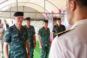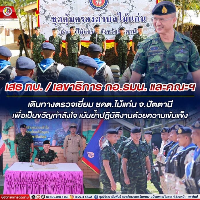 วันนี้ 28 ตุลาคม 2567 เวลา 13.30 น. พลเอก ธงชัย รอดย้อย เสนาธิการทหารบก / เลขาธิการกองอำนวยการรักษาความมั่นคงภายในราชอาณาจักร พร้อมด้วย พลเอก เอกรัตน์ ช้างแก้ว ประธานคณะที่ปรึกษากองทัพบก และคณะฯ ลงพื้นที่ตรวจเยี่ยม ติดตามการปฏิบัติงานของชุดคุ้มครองตำบลไม้แก่น อำเภอไม้แก่น จังหวัดปัตตานี เพื่อรับฟังบรรยายสรุปการปฏิบัติงานในห้วงที่ผ่านมา รวมไปถึงสอบถามข้อขัดข้องต่าง ๆ เพื่อนำไปปรับปรุงแก้ไขให้ดียิ่งขึ้น พร้อมทั้งนำนโยบาย ข้อสั่งการ และกำลังใจจาก พลเอก พนา แคล้วปลอดทุกข์ ผู้บัญชาการทหารบก / รองผู้อำนวยการรักษาความมั่นคงภายในราชอาณาจักร มาถึงเจ้าหน้าที่สมาชิกกองอาสารักษาดินแดน จังหวัดชายแดนภาคใต้ ก่อนจะมอบเครื่องอุปโภค-บริโภค เพื่อเป็นขวัญและกำลังใจในการปฏิบัติหน้าที่ดูแลความปลอดภัยแก่พี่น้องประชาชน อีกทั้งได้พบปะกำลังพลเพื่อพูดคุยสอบถามถึงความเป็นอยู่ โดยมี พลโท ไพศาล หนูสังข์ แม่ทัพภาคที่ 4 / ผู้อำนวยการรักษาความมั่นคงภายในภาค 4, พลตรี วรเดช เดชรักษา รองแม่ทัพภาคที่ 4 / รองผู้อำนวยการรักษาความมั่นคงภายในภาค 4 ส่วนหน้า, นายอำเภอไม้แก่น, ปลัดอำเภอหัวหน้าชุดคุ้มครองตำบลไม้แก่น, หัวหน้าส่วนที่เกี่ยวข้อง และกำลังพลชุดคุ้มครองตำบลไม้แก่น ร่วมให้การต้อนรับ