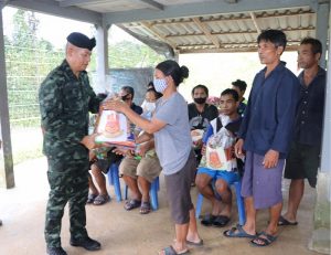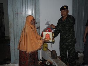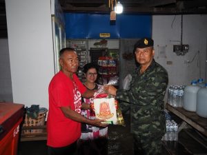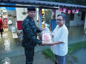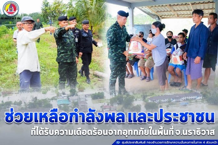 จากนั้นได้เดินทางต่อไปยังพื้นที่ หมู่บ้านสันติสุข บ้านน็อคดาวน์(บ้านย่อย บ้านไอปาเซ) หมู่ที่ 8 ตำบลตันหยงลิมอ อำเภอระแงะ จังหวัดนราธิวาส เพื่อเข้าให้การช่วยเหลือระชาชนไทยพุทธ ที่ได้รับความเดือนร้อนจากอุทกภัยในพื้นที่ โดยได้พบปะเยี่ยมเยียน พร้อมมอบถุงยังชีพ น้ำดื่ม และเวชภัณฑ์ยารักษาโรค เพื่อบรรเทาความเดือดร้อนเบื้องต้นให้แก่พี่น้องประชาชนที่ได้รับความเดือดร้อนจากอุทกภัยในพื้นที่ พร้อมกำชับให้กำลังพลเข้าช่วยชาวบ้านเต็มที่ตลอด 24 ชั่วโมง ขณะที่น้ำเริ่มลด แต่ยังมีฝนตกลงอย่างต่อเนื่อง ให้พี่น้องประชาชนใช้ความระมัดระวังในการใช้ชีวิตด้วยรวมไปถึงสัตว์มีพิษต่าง ๆ และสิ่งของเครื่องใช้จำเป็นให้ช่วยดูแลตนเอง และหากได้รับความเดือดร้อนให้แจ้งเจ้าหน้าที่ในส่วนที่เกี่ยวข้องโดยด่วน
