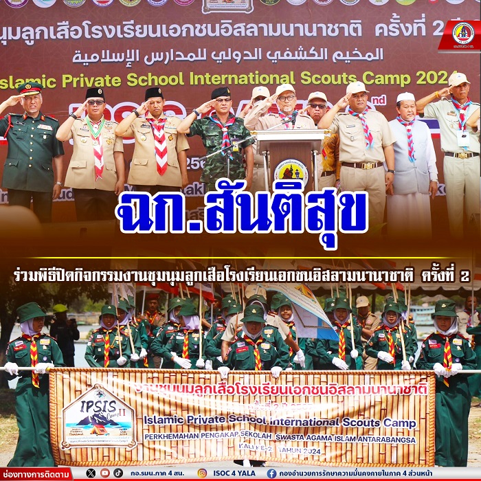 วันที่ 29 ตุลาคม 2567 ชุดครูฝึกมวลชน ชุดควบคุมทักษิณสัมพันธ์ หน่วยเฉพาะกิจสันติสุข ร่วมพิธีปิดกิจกรรมงานชุมนุมลูกเสือโรงเรียนเอกชนอิสลามนานาชาติ ครั้งที่ 2 ประจำปี 2567 โดยมีวัตถุประสงค์เพื่อส่งเสริมและสนับสนุนให้ลูกเสือโรงเรียนเอกชนสอนศาสนาอิสลามจังหวัดชายแดนภาคใด้ เป็นพลเมืองดี มีวินัย มีความรับผิดชอบ รู้จักทักษะชีวิต มีจิตอาสา ช่วยสร้างสรรค์สังคมให้เกิดความสามัคคี ใฝ่หาสันติสุข ผ่านกิจกรรมที่หลากหลาย ทำให้มีทัศนคติที่ดีในกิจกรรมลูกเสือตามแนวทางบูรณาการอิสลาม ตลอดจนได้เชื่อมความสัมพันธ์อันดีระหว่างลูกเสือในกลุ่ม ประเทศอาเซียน ได้เรียนรู้ ในกิจกรรมที่สอดคล้องกับวิถีชีวิตมุสลิมอย่างถูกต้อง สู่การเสริมสร้างสังคมสันติสุข อันก่อให้เกิดความเป็นปึกแผ่นและความมั่นคงของชาติต่อไป โดยมี ผศ.ดร วรวิทย์ บารู ตัวแทนประธานรัฐสภา เป็นประธานในพิธี ณ ค่ายลูกเสือชั่วคราวหาดวาสุกรี อำเภอสายบุรี จังหวัดปัตตานี โดยในปีนี้มีผู้เข้าร่วมงานชุมนุมจากประเทศอินโดนีเซีย ประเทศมาเลเซีย และประเทศไทย