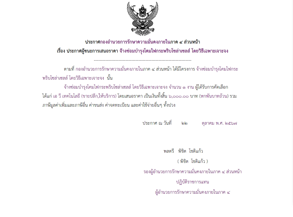จัดซื้อ จัดจ้างประกาศผู้ชนะการเสนอราคา ประกาศผู้ชนะการเสนอราคา จ้างซ่อมบำรุงโคมไฟกระพริบโซล่าเซลล์ โดยวิธีเฉพาะเจาะจง October 30, 2024 302 Share Facebook Twitter Google+ Telegram LINE