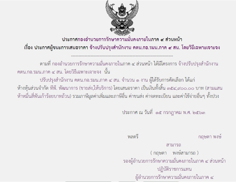 จัดซื้อ จัดจ้างประกาศผู้ชนะการเสนอราคา ประกาศผู้ชนะการเสนอราคา จ้างปรับปรุงสำนักงาน คตน.กอ.รมน.ภาค ๔ สน.โดยวิธีเฉพาะเจาะจง July 17, 2020 1134 Share Facebook Twitter Google+ Telegram LINE