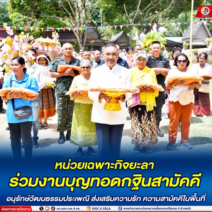 วันที่ 3 พฤศจิกายน 2567 เวลา 12.30 น. ที่วัดบ่อหิน บ้านบ่อหิน หมู่ที่ 4 ตำบลบ้านแหร อำเภอธารโต จังหวัดยะลา พันเอก ยุทธนาม เพชรม่วง รองผู้บังคับหน่วยเฉพาะกิจยะลา เป็นผู้แทน พลโท ไพศาล หนูสังข์ แม่ทัพภาคที่ 4 / ผู้อำนวยการรักษาความมั่นคงภายในภาค 4 ร่วมกับ ผู้นำท้องที่, ผู้นำท้องถิ่น, ส่วนราชการฯ, ภาครัฐ/ภาคเอกชน และพี่น้องประชาชนไทยพุทธในพื้นที่ ร่วมกิจกรรมงานบุญประเพณีทอดกฐินสามัคคี ประจำปี 2567 เพื่ออนุรักษ์วัฒนธรรม สืบสานขนบธรรมเนียมประเพณีอันดีงาม และส่งเสริมการทำนุบำรุงพระพุทธศาสนา ตลอดจนยังเป็นการสร้างความรักความสามัคคีของพี่น้องประชาชนในพื้นที่ ภายใต้สังคมพหุวัฒนธรรม โดยมีพระมหากรกตเขมะปัญโญ รองเจ้าคณะจังหวัดยะลา/เจ้าอาวาสวัดคอกช้าง ประธานฝ่ายสงฆ์ และพลเอกมณี จันทร์ทิพย์ ที่ปรึกษา กองอำนวยการรักษาความมั่นคงภายในภาค 4 ส่วนหน้า เป็นประธานฝ่ายฆราวาส