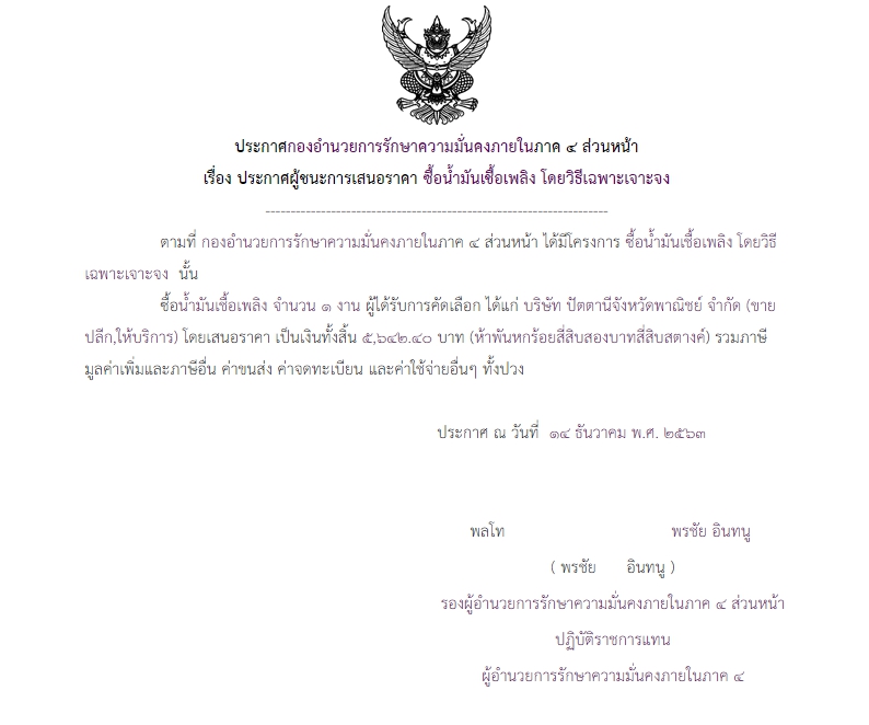 จัดซื้อ จัดจ้างประกาศผู้ชนะการเสนอราคา ประกาศผู้ชนะการเสนอราคา ซื้อน้ำมันเชื้อเพลิง โดยวิธีเฉพาะเจาะจง (5,642.40) December 22, 2020 857 Share Facebook Twitter Google+ Telegram LINE สกบ.กอ.รมน.ภาค 4 สน.