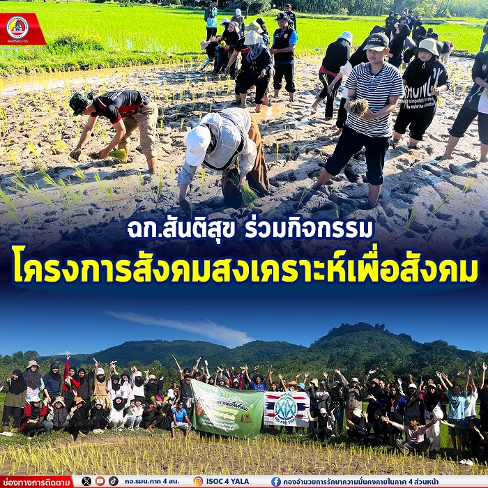 วันที่ 5 พฤศจิกายน 2567 ชุดสันติสุขที่ 106 ชุดควบคุมที่ 951 หน่วยเฉพาะกิจสันติสุข ร่วมกับ ชุดคุ้มครองตำบลทุ่งคล้า เข้าร่วมกิจกรรมโครงการสังคมสงเคราะห์เพื่อสังคม ตอน On the way ส่งต่อรัก เพื่อส่งเสริมให้นักศึกษาได้เรียนรู้ถึงวิถีชุมชน และแลกเปลี่ยนแนวความคิดกับชาวบ้าน ตลอดจนให้นักศึกษามีความรู้ คุณธรรม จริยธรรม และเกิดความสามัคคีในชุมชน ทั้งนี้ยังสามารถปลูกฝังและสร้างจิตสํานึกที่ดี รวมไปถึงสร้างความสัมพันธ์ที่ดีกับคนในชุมชน ซึ่งเป็นการขัดเกลาทางจิตใจให้กับผู้เข้าร่วมกิจกรรมให้รู้คุณค่าของการแบ่งปันและการช่วยเหลือผู้อื่น พร้อมทั้งจัดกิจกรรมแสดงสัญลักษณ์ We Are Thai (โชคดีที่เกิดเป็นไทย) โดยมีนักศึกษาคณะมนุษยศาสตร์ และสังคมศาสตร์ มหาวิทยาลัยสงขลานครินทร์ วิทยาเขตปัตตานี ณ บ้านปะรุกาตือแร หมู่ที่ 2 ตำบลทุ่งคล้า อำเภอสายบุรี จังหวัดปัตตานี