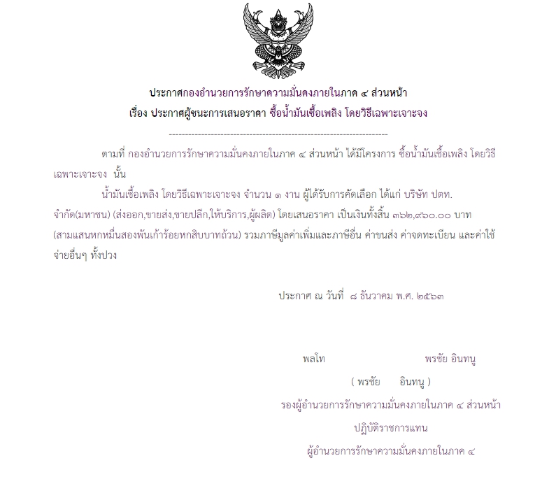 จัดซื้อ จัดจ้างประกาศผู้ชนะการเสนอราคา ประกาศผู้ชนะการเสนอราคา ซื้อน้ำมันเชื้อเพลิง โดยวิธีเฉพาะเจาะจง (362,960.00) December 22, 2020 892 Share Facebook Twitter Google+ Telegram LINE สกบ.กอ.รมน.ภาค 4 สน.