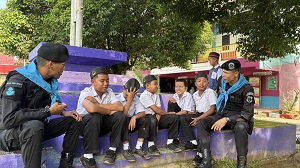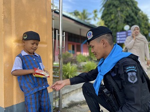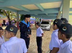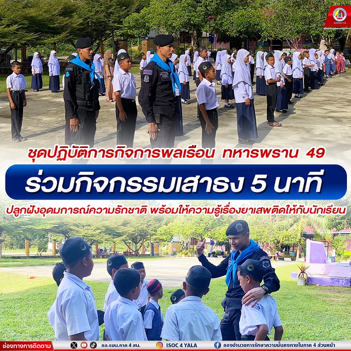 วันที่ 5 พฤศจิกายน 2567 เวลา 07.30 น. พันเอก ภาณุวัฒน์ สุคชเดช ผู้บังคับหน่วยเฉพาะกิจกรมทหารพรานที่ 49 มอบหมายให้ กองร้อยทหารพรานที่ 4914 นำโดย จ่าสิบเอก ปริวัฒน์ ชูโต รองหัวหน้าชุดปฏิบัติการกิจการพลเรือน และกำลังพล ลงพื้นที่ไปยังโรงเรียนบ้านยะออ หมู่ที่ 1 ตำบลจะแนะ อำเภอจะแนะ จังหวัดนราธิวาส เพื่อพบปะผู้อำนวยการ, ครู, และนักเรียน สานสัมพันธ์ที่ดีระหว่างเจ้าหน้าที่ทหารและบุคลากรครูในโรงเรียน พร้อมทั้งร่วมกิจกรรมเสาธง 5 นาที จัดระเบียบแถว เคารพธงชาติ ร่วมกับครูและนักเรียน ปลูกฝังอุดมการณ์ความรักชาติ และรณรงค์ป้องกันยาเสพติดในเยาวชนกลุ่มเสี่ยงให้กับนักเรียน ตลอดจนพูดคุยเรื่องแนวทางการรักษาความปลอดภัยให้กับบุคลากรทางการศึกษา นักเรียน เพื่อเป็นการสร้างความเชื่อมั่นให้กับประชาชนในพื้นที่
