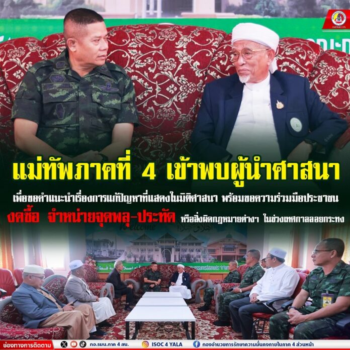 วันที่ 5 พฤศจิกายน 2567 เวลา 13.30 น. พลโท ไพศาล หนูสังข์ แม่ทัพภาคที่ 4 / ผู้อำนวยการรักษาความมั่นคงภายในภาค 4 พร้อมคณะพบปะหารือข้อราชการกับคณะทำงานของคณะกรรมการอิสลามกลางประจำจังหวัดปัตตานี เพื่อขอคำแนะนำในการแก้ไขปัญหาในพื้นที่ ถึงข้อปฏิบัติต่างๆที่สำคัญอันเป็นความรู้ความเข้าใจที่จะนำไปสู่การสร้างความร่วมมือในการแก้ไขปัญหาความมั่นคงในพื้นที่ ภายใต้การทำงานด้วยหลักการบูรณาการกับทุกภาคส่วน เพื่อสร้างพื้นที่ปลอดเหตุประชาชนปลอดภัย