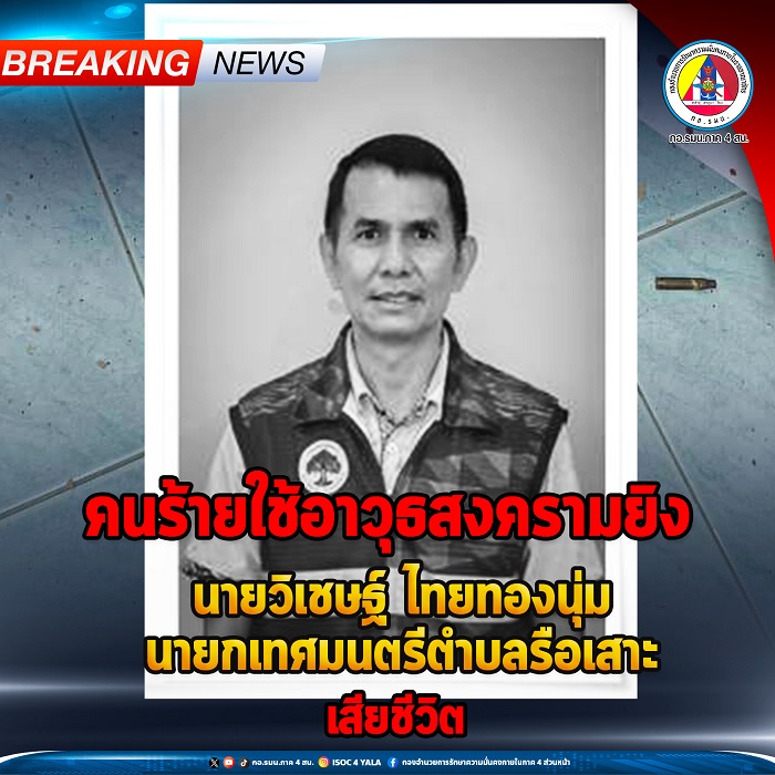 วันนี้ 7 พฤศจิกายน 2567 เวลาประมาณ 11.40 น. เกิดเหตุคนร้ายไม่ทราบจำนวนได้ใช้อาวุธปืนสงครามยิง นายวิเชษฐ์ ไทยทองนุ่ม นายกเทศมนตรีตำบลรือเสาะ ภายในโรงงานแฮนด์อินแฮนด์ หมู่ที่ 5 ตำบลรือเสาะ อำเภอรือเสาะ จังหวัดนราธิวาส ทำให้เสียชีวิตในที่เกิดเหตุ ล่าสุดเจ้าหน้าที่เข้าทำการควบคุมพื้นที่และปิดกั้นที่เกิดเหตุ สำหรับความคืบหน้าจะรายงานให้ทราบต่อไป
